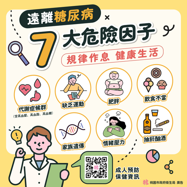 衛生局表示,代謝症候群、缺乏運動、肥胖、飲食不當、家族遺傳、情緒壓力、吸菸酗酒等,都是糖尿病的危險因子,由於糖尿病前期並沒有明顯症狀,多數人常等到出現多吃、多喝、多尿或體重減輕時,才發現已經罹患糖尿病,如果血糖一直控制不好,可能導致後續血管病變、視網膜病變、心血管疾病、腎臟病等合併症的發生。因此呼籲定期監測血糖,並搭配少油、少鹽、少糖及高纖的「三少一高」飲食原則,及規律運動、控制體重、遵醫囑服藥等,有助於預防糖尿病與延緩嚴重併發症的發生。