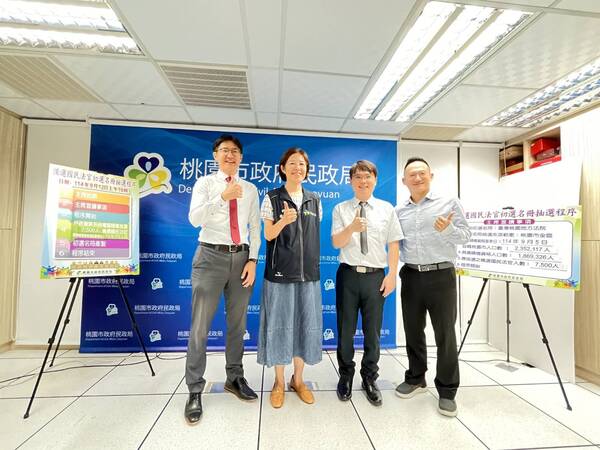 桃園市政府12日上午10時於民政局六樓戶政科,公開辦理臺灣桃園地方法院「115年備選國民法官初選名冊」隨機抽選作業,邀請臺灣桃園地方法院庭長黃柏嘉、臺灣桃園地方檢察署主任檢察官吳昇峰及桃園律師公會秘書長葉禮榕律師到場見證,秉持公開、公正原則,抽選出7,500位備選國民法官。