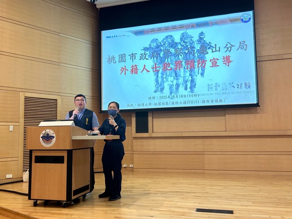 為提升在臺外籍學生對我國法令及生活安全的認識,避免因文化及語言差異而誤觸法網,桃園市政府警察局龜山分局於10月16日下午前往銘傳大學桃園校區舉辦「外籍學生犯罪預防宣導」活動,邀集外事、刑事、交通及婦幼等單位共同參與,針對約250名來自越南、印尼、泰國及美國籍等多國學生進行法令宣導與安全教育,現場互動熱烈,氣氛活潑。