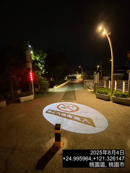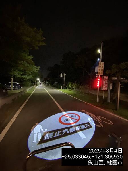 桃園市政府於桃林鐵路沿線步道導入「智慧告警投射燈」系統,提升夜間可視度並強化行人安全。該設備採用高辨識度 LED 光源,於入口處即能清楚投射「禁止汽機車進入」警示,降低車輛誤闖風險,保障民眾散步與運動環境。