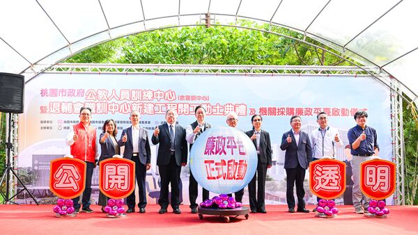 桃園市長張善政(21)日下午前往八德區,出席「桃園市政府公教人員訓練中心(含警訓中心)暨退輔會職訓中心新建工程開工動土典禮」及「機關採購廉政平臺啟動儀式」。張市長表示,本案工程總經費約16.56億元,預計於117年完工,完工後將由退輔會職訓中心、警察局訓練中心及公教人員訓練中心共同使用,成為本市強化公務與警察專業訓練的重要基地。