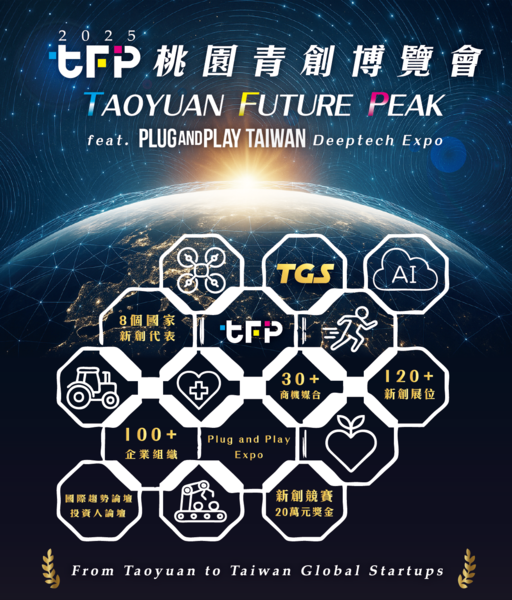 由桃園市政府青年事務局主辦的「2025 桃園青創博覽會 Taoyuan Future Peak」(TFP),將於 12月9日在桃園會展中心盛大登場。今年展會規模、論壇深度與國際鏈結全面升級,提出「八方匯聚 × 新創齊飛」的主題精神,結合全臺與國際生態系資源,打造 2025 年最具國際視野的新創年度盛會。桃園市長張善政誠摯邀請企業、投資人、創業者及所有關注創新的民眾,共同來參與這場匯聚臺灣與全球優秀新創團隊的年度盛會。