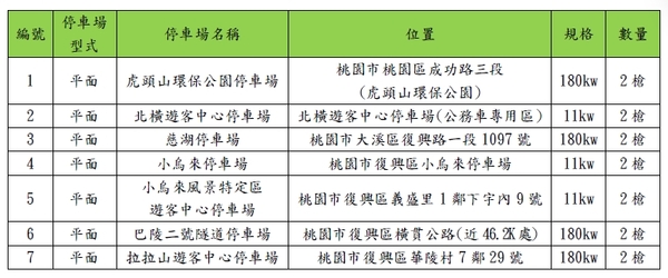 為推動淨零碳排、打造低碳旅遊環境,桃園市政府風景區管理處於114年完成 7 處風景區公有停車場電動車充電樁基礎設施建置,包含 180kW快充8槍、11kW慢充6槍,目前已全數投入營運並開始收費。