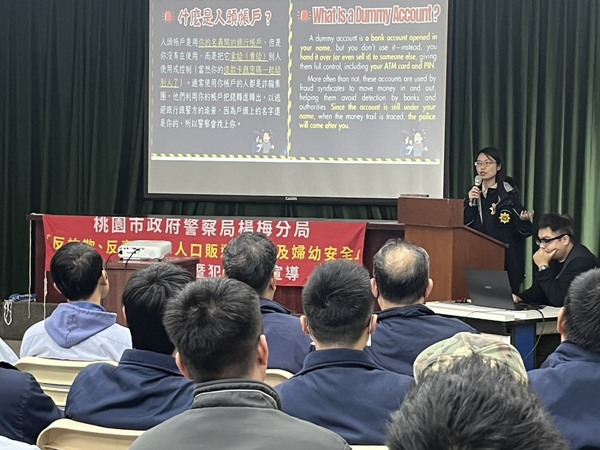 近來發現有外籍移工淪為詐騙車手或成為人頭帳戶之案件,為有效遏止詐騙集團對外籍移工的危害及強化移工犯罪預防觀念,避免移工銀行帳戶、手機門號等淪為洗錢工具,楊梅警分局防治組長吳黨元、外事警員黃彥銘及偵查佐蔡幸蓉等於19日至轄區萬洲化學股份有限公司邀集約260位菲律賓及印尼籍移工及公司幹部宣導。
