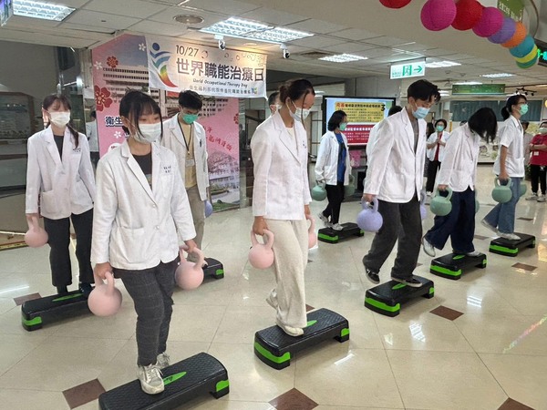 桃療職能治療師親自示範下肢阻力性登階訓練。(桃療提供)