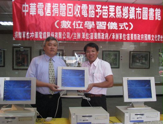 中華電信苗栗營運處及企業客戶分公司12日捐贈55部回收電腦,給苗栗縣13個鄉鎮市圖書館,其中竹南及苑裡各取得10部電腦,將成立「苗栗縣數位學習據點」。國際文化觀光局長林振豐表示,回收電腦除了落實資源回收再利用的價值之外,更解決了偏遠地區資訊不足的問題,縮短城鄉數位差距。