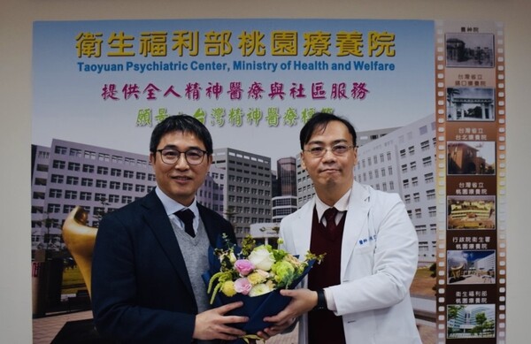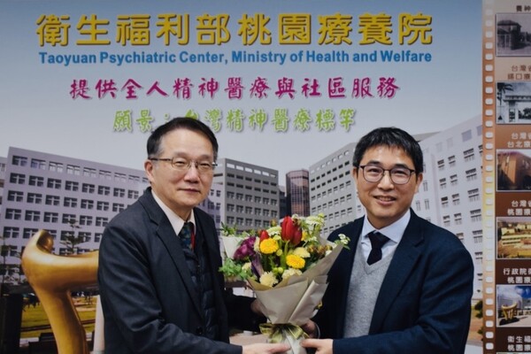 桃療廖定烈院長(左)從李俊宏副院長手中接下歡迎花束,為桃園療養院及精神醫療帶來新篇章。(桃療提供)