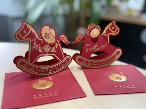 【記者葉志成 /桃園報導】桃園市政府民政局長劉思遠表示,「元氣搖搖馬」福袋造型可愛,發想自童玩搖搖馬,搭配立體底座設計,可放置於桌面輕輕搖擺,增添動感與趣味;馬鞍上的「馬載祿厚」字樣,蘊含臺語諧音「明天更好」的祝福寓意,而馬背上可轉動的金元寶與錢幣機關,象徵「馬上賺錢、財源滾滾」。今年市府共準備近6萬個福袋,數量有限,送完為止。