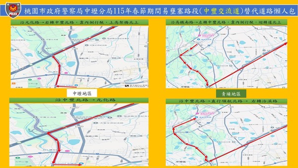 此外,配合桃園市新增「高架中豐交流道」通車,中壢警分局也把握「桃園年貨大街」於銀河廣場舉辦期間,主動進行交通宣導。警方除上台向民眾說明交流道動線外,也深入人潮密集處發放印有中豐交流道替代路線資訊的宣導品,協助民眾熟悉進出動線及分流規劃,並呼籲前往青埔地區的雙北民眾多加利用高架中豐交流道,避開車流集中的大竹交流道,以分散車潮、提升整體交通運作效率。