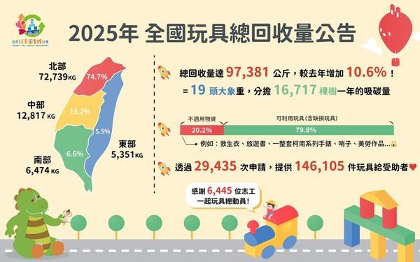 【綜合報導】永續行動持續在台灣發酵。**台灣玩具圖書館協會**公布「2025年玩具回收成果報告」,統計過去一年共回收高達97公噸的二手玩具,不僅有效減少廢棄物,也為環境永續與社會公益注入實質力量。