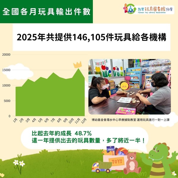 在資源再分配方面,協會表示,全年共整理並媒合146,105件玩具,陸續送往社福機構與教育單位,提供弱勢家庭、兒童與教學現場使用,讓玩具不只是物品,更成為陪伴與學習的重要媒介。