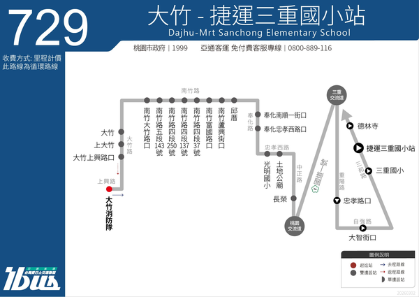 為提升蘆竹區大竹地區往返大台北地區乘車便利性,並協助分擔國道客運運輸需求,桃園市政府交通局規劃試辦市區客運新路線「【729】大竹-捷運三重國小站」,將自115年3月23日(一)起試辦營運,提供蘆竹大竹及下南崁地區民眾往返大臺北地區之全新通勤選擇。