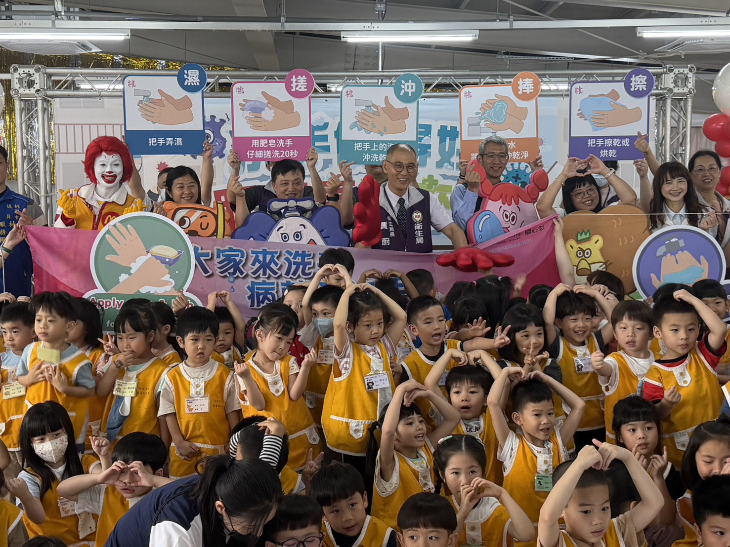 隨著天氣逐漸轉暖,國內即將進入腸病毒流行高峰期,依據衛生福利部疾病管制署數據統計,第14週(115年4月5日至115年4月11日)桃園市腸病毒門急診就診人次達413人次,全國腸病毒感染併發重症個案4例,本市目前無重症病例。為守護學童健康並強化校園的防疫意識,桃園市政府衛生局與麥當勞叔叔之家慈善基金會結合,於4月15日在桃園市立桃園幼兒園舉辦「洗手做得好,腸病毒不來找」記者會,透過寓教於樂的方式,教導幼童落實正確的洗手步驟,並呼籲家長與教育、托育機構共同築起堅實的防疫陣線,降低腸病毒在校園與社區中交叉傳播的風險。