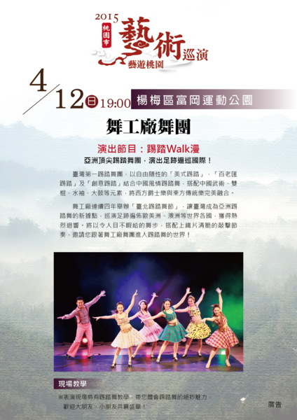 過去連續舉辦2年的「桃園藝術下鄉」廣受桃園市民的喜愛,今年開始以「桃園藝術巡演」的名稱與大家見面,讓民眾更親近藝文,以落實文化平權。4/11(六) 及4/12(日)將由來自韓國亂打秀天團「Fanta Stick幻多奇秀」及臺灣第一的踢踏舞團「舞工廠舞團」為今年的桃園藝術巡演打頭陣!韓國幻多奇秀將以五光十色的燈光效果搭配節奏感十足的韓國鼓打擊秀,結合韓國傳統的弦樂演奏在龍潭運動公園,讓觀眾體驗獨特的韓式音樂魅力;舞工廠舞團將於楊梅的富岡運動公園帶來創意十足的美式踢踏舞,現場也將邀請台下觀眾上台,來場即興的踢踏舞教學,讓觀眾不僅欣賞精彩的演出,更能與舞者進行趣味互動,體驗踢踏舞的魅力。