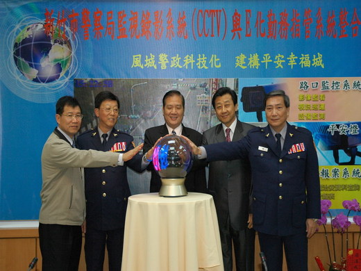 新竹市首創全國建置的監視錄影系統CCTV與E化勤務指管系統整合完成,(5)日上午10時舉行啟用典禮,由市長許明財、市警局局長李金田、副局長張弘文、市議員吳青山、大猩猩科技公司董事長寇世斌共同主持啟用儀式。