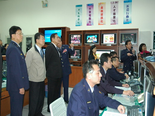 啟用儀式後,許市長一行同時於市警局勤務指揮中心觀看日昨剛啟用的平安燈緊急通報系統,現場觀看勤務示範受理民眾報案演練情形;當民眾按下按鈕,通報系統就會啟動警示燈及警報器,自動監視錄影,同步傳送至警察局或分局勤指中心,警方獲報後,以視訊電話與報案人通話,指派巡邏人員趕抵現場處理。這套勤務演練,透過科技辦案,增添民眾安全感,將可有效嚇阻歹徒犯案。