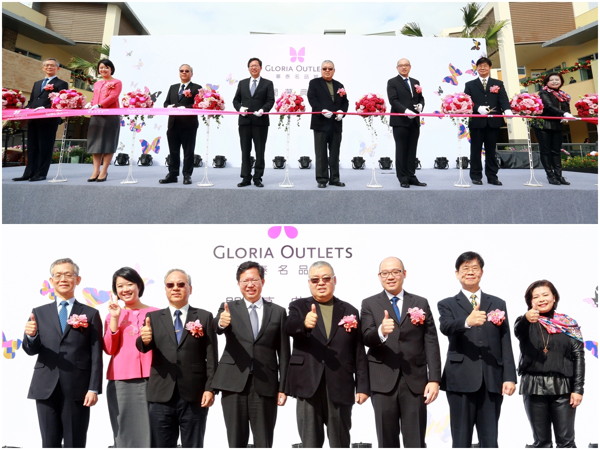 台灣首座美式露天物村風格的GLORIA OUTLETS華泰名品城18日在桃園青埔特區舉行隆重開幕儀式,現場嘉賓雲集,各界政商人士齊聚致賀,桃園市長鄭文燦、交通部次長范植谷與華泰集團董事長陳天貴、執行長陳炯福、國泰人壽總經理熊明河等多位貴賓共同進行剪綵儀式。