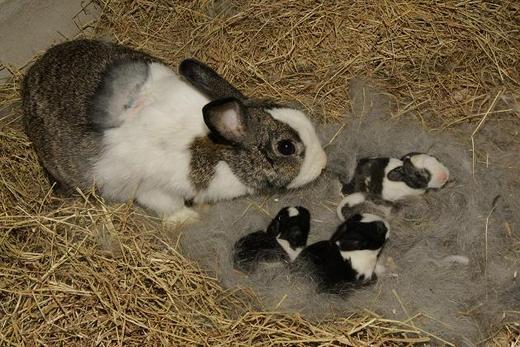 兔子藉著高繁殖力來穩定族群數。雌兔只要3個月即達到性成熟,可以開始交配繁殖。兔子的妊娠期很短,約30-40天,一胎可產下4-12隻仔兔。這次生寶寶的是荷蘭道奇兔,4隻兔寶寶在檢疫期間誕生,兔媽媽拔下身上的毛鋪在巢中,看4隻兔寶寶的花色跟媽媽一模一樣。