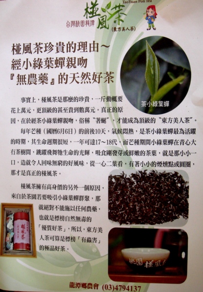 東方美人茶因須經過小綠葉蟬的叮咬,因此絕對不能噴灑農藥。在講求天然無毒的觀念下,經過蟲害的東方美人茶,卻成為茶之極品。
