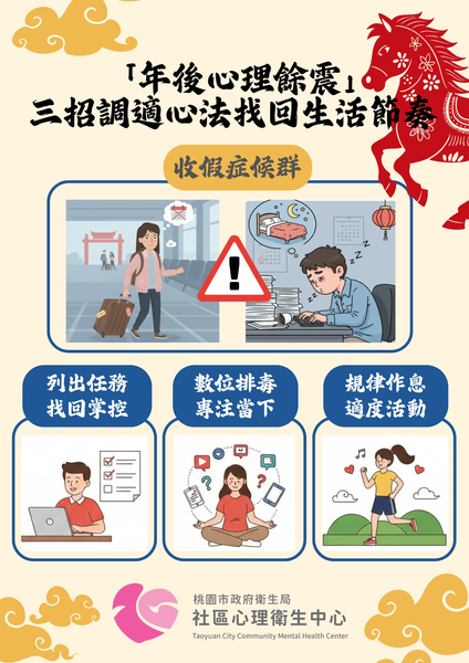 隨著春節連假結束,許多民眾重返職場或校園,卻發現自己出現注意力不集中、莫名疲累,甚至焦慮與失落感。桃園市政府衛生局提醒,這可能是身心在經歷較大生活轉換時常見的「心理餘震」,屬於正常適應反應,不必過度擔...