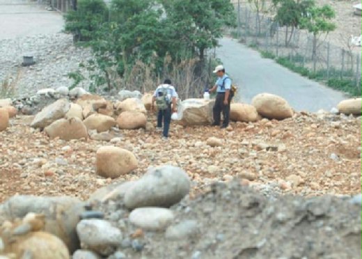 女孩,撿這種神龜文石要眼光銳利,看到表面有裂紋的蛛絲馬跡或是屬於鐵質的,馬上用噴槍噴水,等快乾燥時紋路好壞很清晰的就可以分辨清楚。石場沒有任何遮蔽物,陽光照射在石堆把溫度提升不少,汗水不停的滴在石頭上,真正的體會出汗如雨下的感受。