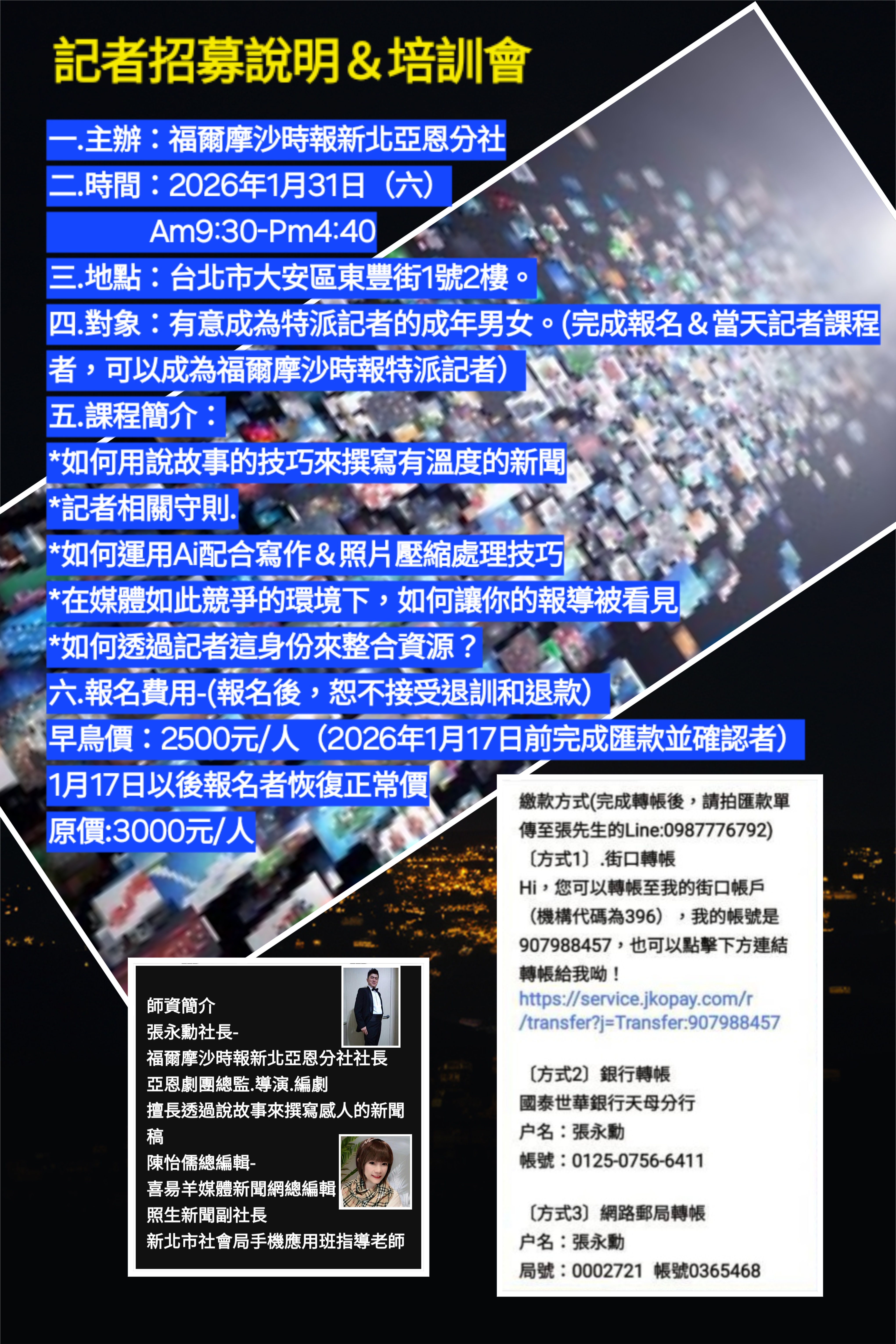 【記者文珍/新北市報導】由 《福爾摩沙時報》新北亞恩分社 主辦的📣【記者招募說明&實戰培訓會】即將登場! 如果你曾想過—— ✔ 如何用文字與影像影響社會 ✔ 如何把「記者身分」變成你的專業優勢 ✔ ...