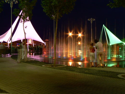 當天色變暗,河岸兩旁的景觀燈全部亮起,加上沿岸大樓五光十色的霓虹燈,又有遊船在河中緩緩而行,美得另人難以用言詞形容。到了類似台北市政府前廣場的「風帆廣場」,音樂伴著水舞,許多年輕人跟著跳舞、嬉戲。