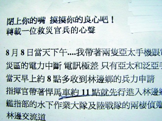 陳情信指名嘴們個個像救難專家與治水達人,沒有實際了解災區現況就質疑東、質疑西,「看到他們用不負責任的言語中傷國軍、打擊官兵士氣之際,真想叫他們趕快閉嘴,有本事就趕快來幫忙救災。」