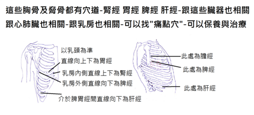 腎經(乳內側) 胃經(乳中線) 脾經(乳外側) 肝經(乳外下方)