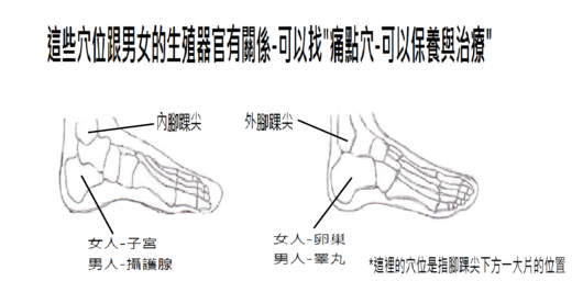 外側腳踝尖 - 卵巢(調經)/睪丸(它是在膀胱經的位置)