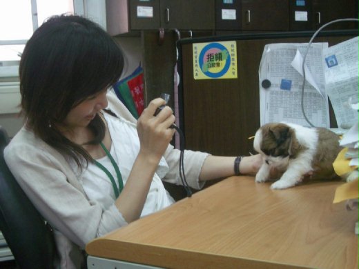 圖二:狗狗在混亂的立法院記者室桌上玩
