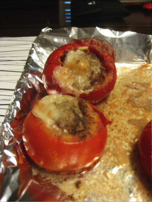 圖二:番茄起司鑲肉(把番茄從蒂頭切開,用湯匙把中心的番茄果肉掏到碗內,準備絞肉以米酒、蒜、鹽巴、太白粉略醃,再混入剛掏出的番茄果肉,一起塞回中空的番茄內,最上層鋪一片起司,放入預熱過的烤箱,以兩百度烤20-25分鐘)