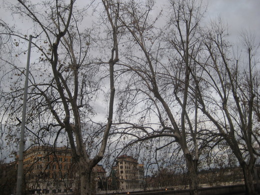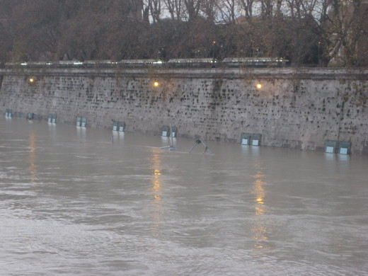 首當其衝是淹水。貫穿市區的台伯河水位急漲,觀光船撞上橋墩,河床小樹差點沒了頂,剩下一根根枯瘦樹梢,可憐巴巴地從水裡冒出頭來。我終於親眼見識,「水長船高」是什麼景象(見上圖)。