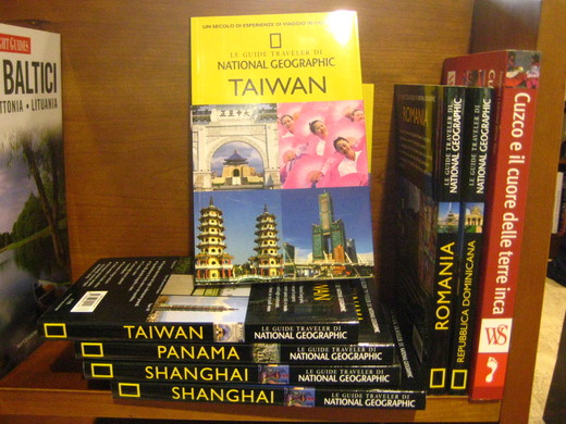 而且,行萬里路勝讀萬卷書,出門總是會有驚奇。在AUDITORIUM偌大書店亂逛時,赫然發現旅遊書架上夾了兩本國家地理頻道出版的「TAIWAN」介紹。當然,很賊的我立刻做了一件自己出書時很想做卻沒膽做的事,就是趁大家不注意,把它們移到了最上層!(下圖二)