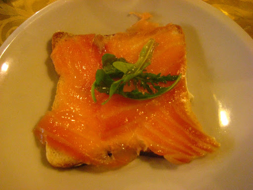 坐下來開始上開胃菜,先來一人一盤燻鮭魚麵包。(希哩呼嚕吃完,真開胃)