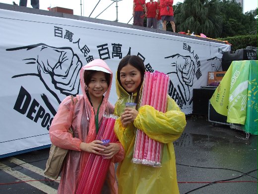第三天捲土重來。起個大早先去買可愛的粉紅色果凍雨衣、防水的尼龍包,帶了超硬精裝封面的筆記本。結果白白破費,當天晚上就接到報社通知,社長贈送我們GORE-TEX風衣。儘管發完稿已接近半夜十二點,牡羊座的愛競爭心作祟,我還是堅持當晚就衝回報社領,隔天才能即時到凱道「爭奇鬥艷」。