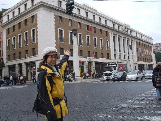 原以為此次是以觀光客身分出現,不會刻意經過使館,令人驚喜的是,梵蒂岡使館就位在通往聖彼得大教堂的主要道路上,遠遠望去,那面再熟悉不過的青天白日滿地紅旗,詭異地與著名羅馬神話裡的「狼嬰」(見註一)圖樣隔街相望,背景則是教堂巴洛克風格的華麗圓頂與雕塑,以及由284支圓柱環抱的壯闊廣場。