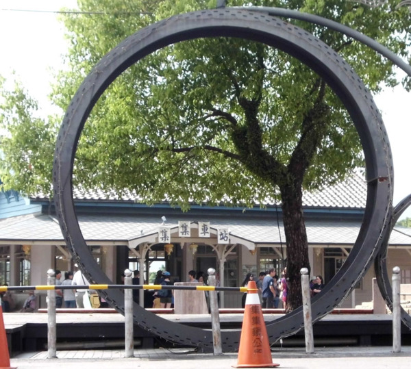 透過火車巨輪看集集車站。