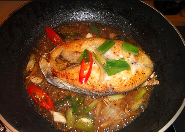 (2)煎熟後的土魠魚,放少許油、蔥白、薑絲、蒜片、辣椒片爆到香氣出來。