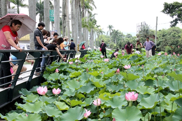 南投中興新村省府路兩側荷花池的荷花已悄悄綻放,粉嫩花朵在青翠綠葉襯托下更顯嬌媚,攝影人士流連取景,家長也帶著孩子賞荷,南投市公所決定6月重辦荷花季活動,預定6月9日開幕。