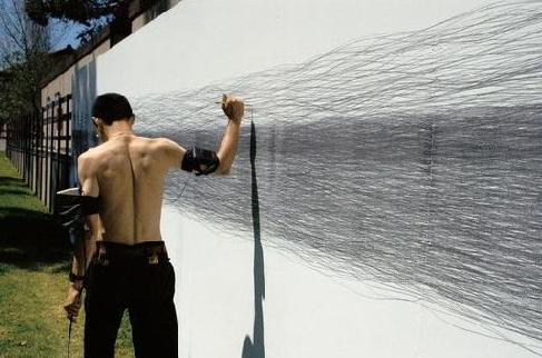 “ 藝術家在這片牆面前冥想:「如果一枝筆,可以是一個人的一生。那麼在漫長的生死輪迴中,我重複走出的是什麼樣的人生線條?」帶著渴念、厭棄等錯綜複雜的情感,行者持續走著,而始終沈默的卻是筆。 ”