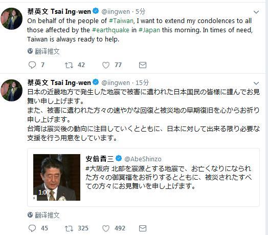 蔡英文似乎不滿足於僅僅通過發言人表達慰問之情,之後在推特上通過日語表示慰問並且手動艾特了日本首相安倍晉三,10分鐘後再次通過英語發文表達關切...