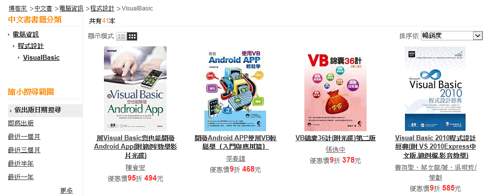 如圖所示,最近博客來網路書店VB程式設計類書的排行榜盤據前兩名都是使用B4A這個軟體製作Android App的書,也讓我寫的書只能「屈居」第三。就當我是攻擊對手,間接拉抬自己的作品排名吧?我真的忍不住想提醒這些買書的人士,多考慮一下,B4A用處不大的!因為我自己就嘗試學過也用過,同時因為工作的需要,分析評估過其他的App解決方案,結論是學B4A真的沒用。其實在金石堂書店排行榜上,B4A的書也熱銷過一陣子,現在已下滑到二三十名之外了!