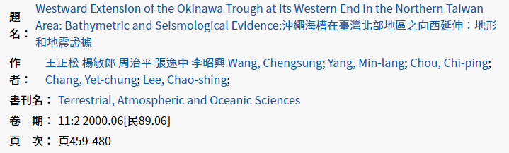 上面這篇論文主要作者是我的碩士班指導教授王正松博士,但是各位可以找他證實,之所以有這篇論文,跟我博士班時期對於台灣北部海域的地質地形研究大有關係。當我因為論文發表不順利,心灰意冷改作自動化地形辨識演算法研究之後,就將累積數年的台灣北部與海域地質地形相關研究資料打包送給王老師了!