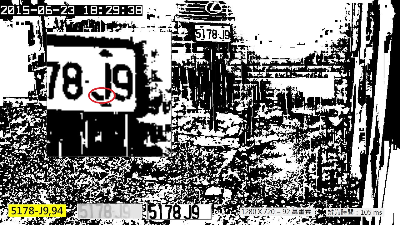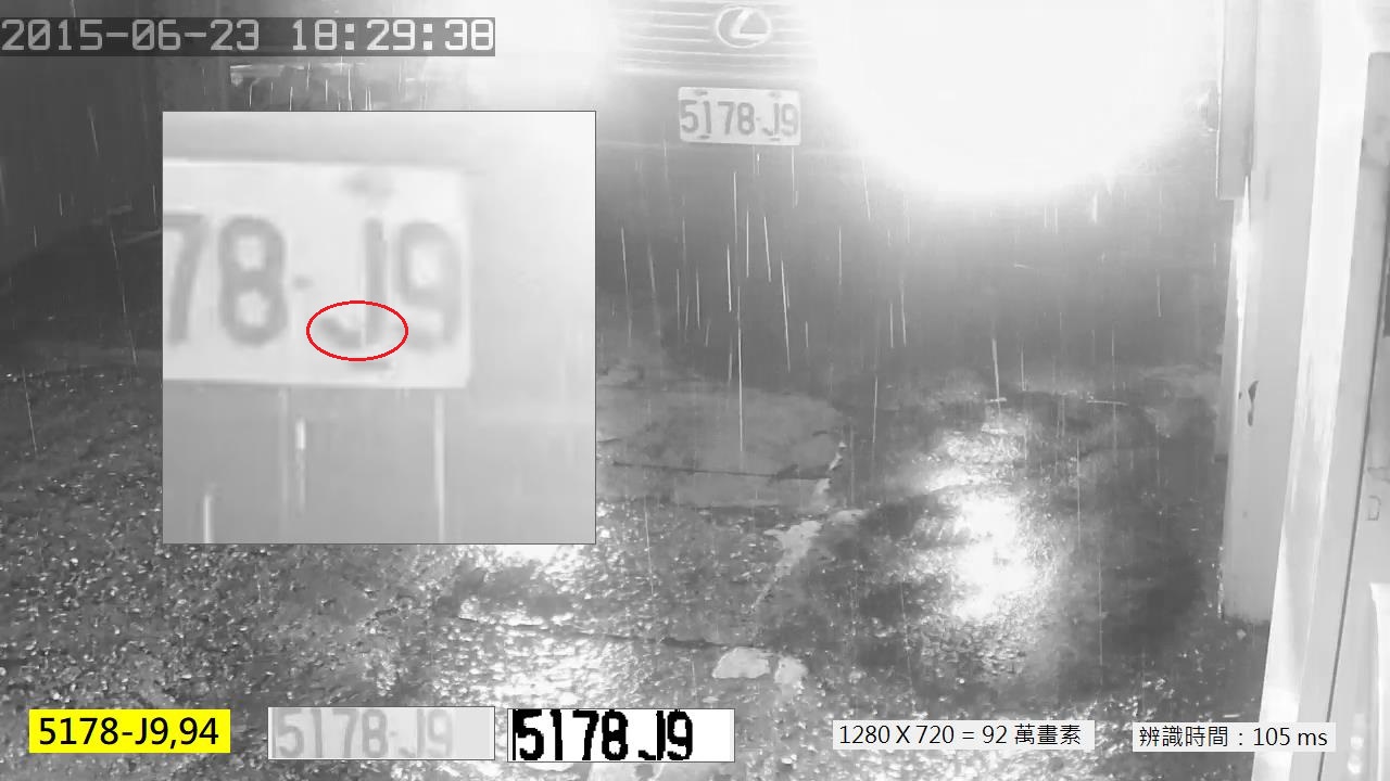 但即使是超大豪雨,這些「雨線」在影像上產生的雜訊密度,大概就是如上的程度而已!如果某條雨線剛好切過我要拍攝的目標車牌,當然就會破壞車牌影像了!如果破壞程度足以讓我的軟體失效或誤認,就是系統失效了!這個案例似乎我還是辨識成功了!但是請大家看看細節!