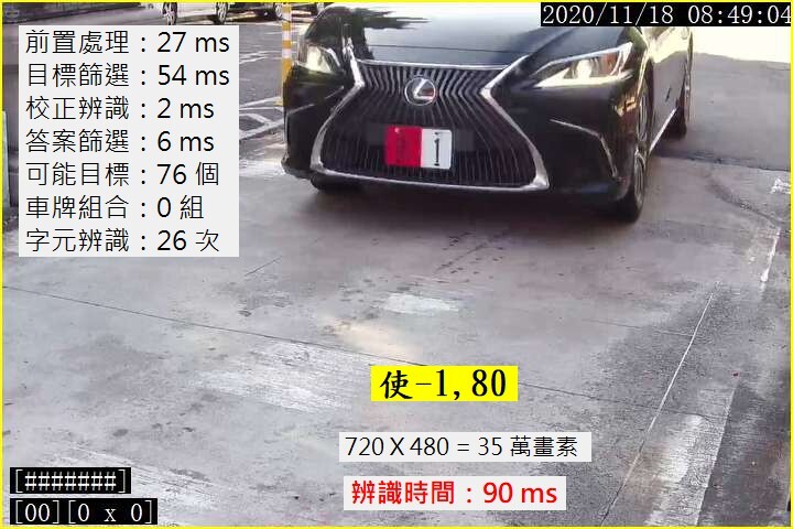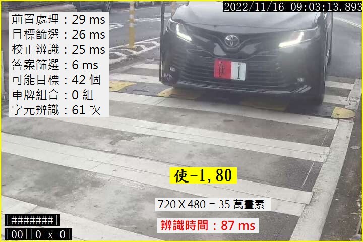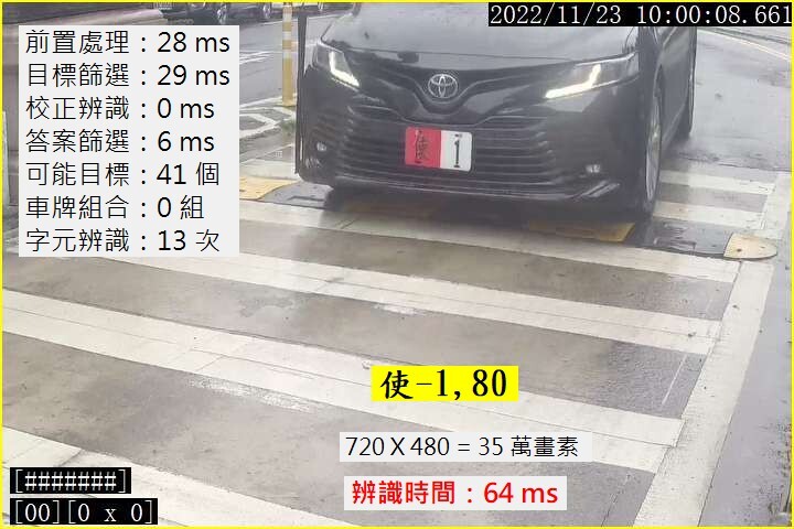 要避免這種狀況,我的對策就是把這種辨識當作類似「候補」的地位,如果畫面中已經發現其他任何可以確定的車牌,就不會啟動例外運算浪費時間刻意找它了!所以只有它是唯一主角時才會被辨識出來!而且很多類似1的目標或雜訊會在前面的正常處理中被檢視篩選,所以剩下可能是使1的代處理目標就非常少了!不會浪費太多額外時間的!看看這幾個案例就知道,辨識時間還是在100毫秒以下!