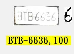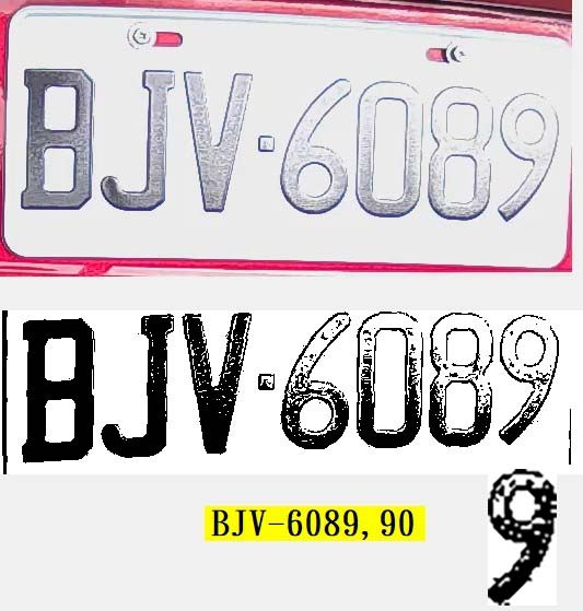 我們做來比對字元的字模當然都是實心的,所以比對出來的結果當然很難正確!置頂圖的最上方是尚有輪廓足以完成辨識的原圖,中間是二值化加上對整個「車牌」作了幾何校正後的影像,左邊的三個字還好,右邊的四個數字都呈現空心狀態,人眼辨識是沒有問題,但辨識軟體如果不做特殊的處理就很容易辨識錯誤了!