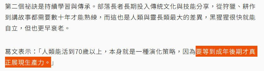 這種演化趨勢其實越到人類文明化科技化之後就更加明顯!會用電腦的老人生產力絕對不輸年輕人!只要長者沒有失智或失去基本的行動力,其實是越老越有社會價值與功能的!七八十歲的總統或老闆很多,通常也可以運作良好的!所以預設人老到一個程度就「不行」了?必須在家休息等死?其實是個不合乎生物科學的錯誤概念!