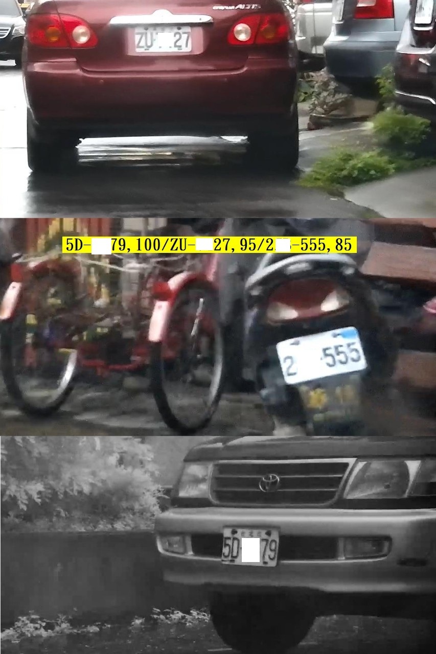 看得懂上面這張影像嗎?這是我的私人尋車業的客戶,使用我的車載車牌辨識軟體在行進中的同一台車上,使用多個攝影機拍到,也辨識到車牌,留存下來的車牌照片,再經過剪輯成的影像!我的軟體只要確認辨識到任何一個車牌就會自動存一張影像,他們上街尋車一天就會有數千張辨識結果的影像!