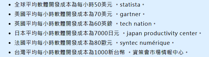 如上的各國標準,全球平均是台灣的1.5倍!日本大概就是全球的平均值,歐美是台灣的2到3倍!所以台灣的軟體開發價是嚴重偏低的!不僅絕對比對岸中國低,有沒有比印度、或東南亞等國家高?都很難說!所以我搬到任何其他地方開業,應該都會比在台灣有錢!